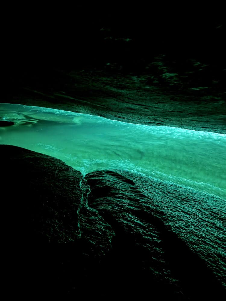 Na segunda parada, desembarcamos na Gruta do Acaiá, onde fazemos uma pequena trilha e acessamos a gruta. A cor da água na Gruta é deslumbrante, parece até bioluminescência. Mas na real, é a água cristalina entrando por uma fresta e iluminada pela luz do sol.