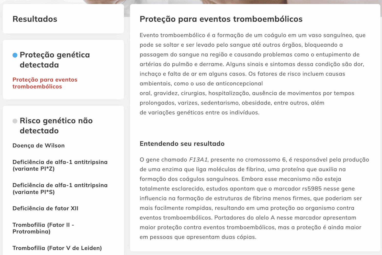 Ao longo do resultado também são sinalizados os marcadores genéticos que funcionam como uma proteção do corpo contra doenças específicas.