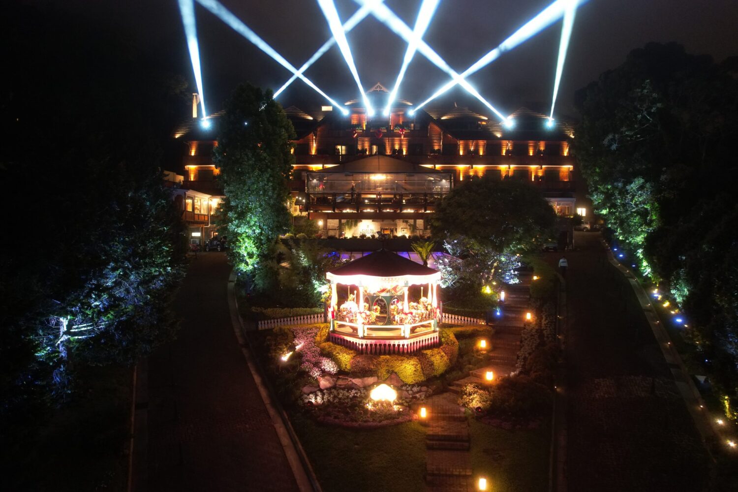 O espetáculo de luzes é uma projeção encantadora e muito impactante, com variadas tonalidades de cores sendo projetadas na frente do hotel que se destaque pelo encantador carrossel que fica na entrada do empreendimento.