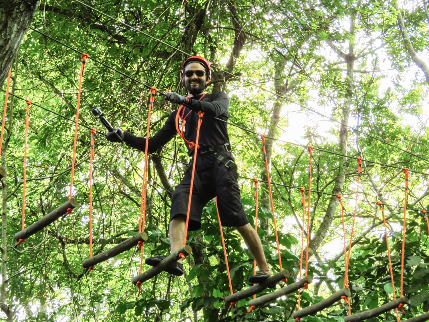 Começamos nossa tarde no Cabanas com o arvorismo. Logo após a trilha, chegamos ao topo das árvores pela parede de escalada.