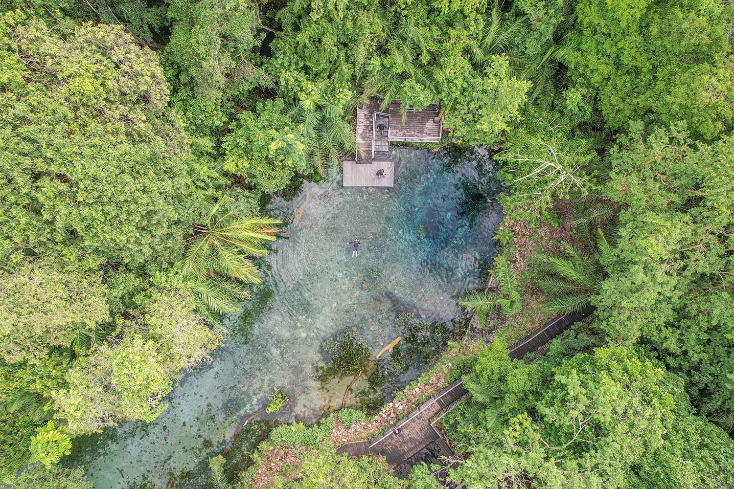 Mesmo em um dia nublado, é possível ver os diversos tons de azul e verde da espetacular Nascente Azul e seus 7 metros de profundidade.